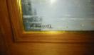 額縁のガラスにぽつぽつとした茶褐色の汚れが内側にありますが、作品が二ヶ所、内側から釘で打たれている為に外せません(外すのに作品を痛める恐れがあるため)。