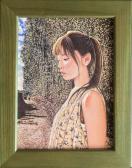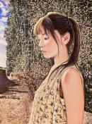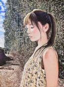 この絵で何故『決別』なのか? と思うかもしれませんが、実は向かって左側の道の遠くに去っていく人を描いています。構図はかなり考えました。空なんか向かって左上にほんのちょっと。バックは殆ど鬱蒼とした林に覆われています。大胆な構図になったと自負しています。服は出品中の『晩夏』と同じですが女の子は違う子です。風景は実在、『消えゆく風景』『石垣』の近くです。あと、元々マスキングは好きでないので、今回はマスキング液やマスキングテープは一切使用せず描きました。こういうバック等が細かい場合、マスキングした方が楽なんでしょうが敢えて使用していません。説明文にマスキングと書いてない場合は使わないで書いています。尚、午前に撮影した絵と午後に撮影した絵でこんなにも色合いが違うということをお見せしたくて画像に両方掲載しています(褐色ぽい方が午後)。