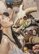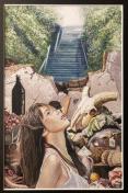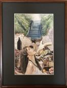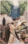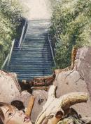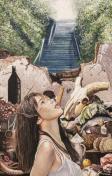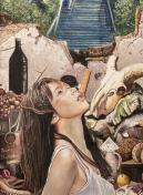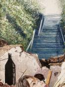 自分で言うのもなんですが、この絵はかなりの傑作なんじゃないかと。だからあまり売りたくないなぁ、ってことで高額です。始まりは人物画と風景画と静物画をわざわざ分けて描く必要ないな、てか、面倒臭ぇから全部纏めて描いちゃえ、という所からで、構図はかなり考えました。それだけ様々な要素を入れても遠くへ突き抜ける様な絵にしたかったからです。『天国への階段』というタイトルは後付けなんですが、自分の考えた言葉でない様な気がして検索してみたら、レッド・ツェッペリンが70年代頃に作った歌が。けれど、私はローリング・ストーンズ辺りは聴いていましたが、ツェッペリンは殆ど聴いておらず、多分、頭の片隅に『天国への階段』というフレーズが残っていて出てきたのだと思います。ただ、その動画を観ると、全く意識していなかったのに、絵画に描いたことを歌われているようで不思議な感覚を覚えました。