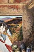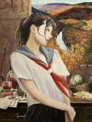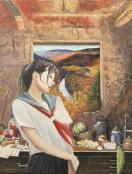 人物・風景・静物やら、一枚の絵の中に全部描きたいなぁ、と思って前回描き(天国への階段)、今回は風景と静物だけにしようと思ったのですが、何か描き足りなくて純朴な女子高生も絵の中に入れてしまおうと、かなり風景と静物を描き込んだ後に思い、構図もかなり考えて付け加えました。油彩やアクリルでなく水彩なのでデッサンに狂いが生じるとオシャカになるのを覚悟して何とか納めました。