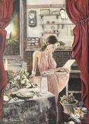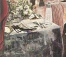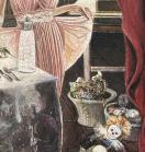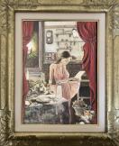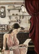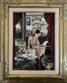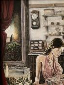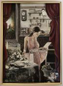 殆どが空想の室内風景。タイトルの『ピエロ』は(向かって右下)実際に部屋にある人形です。昭和レトロなのかそれ以前なのか、実家にあったかなり歴史のある人形で判りませんが、古い海外のパンク頭のピエロ(道化師)です。まあ、それはさておき、実はこの絵画、ある場所を敢えて構図を色合いの関係でずらして描いています。尚、朝方に撮影したものと昼間に撮影したもので色合いが全く異なります。スマホ等での絵画撮影は非常に難しく、何年撮影しても同等の色合いが出せません。尚、額縁は、以前油絵の個展時に使用した油絵用額縁の中古で数カ所傷があります(写真参照)。