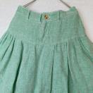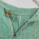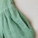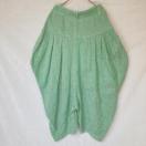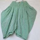 麻と綿のライトグリーンサルエルパンツ、ゆったりとしたひし形シルエット。