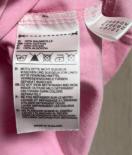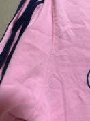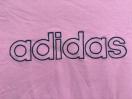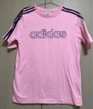 ピンクのadidasロゴTシャツ、肩にネイビーのストライプ付き、Lサイズ。