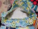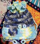 (水色黄色等のグラデーション)(紺色グレー等のグラデーション)ソフトレース糸で編んだ巾着にお花を付け 裏に白色の生地を使いました。