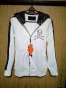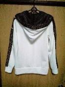 フード、腕にはレオパードラインが入り左腕部分にはロゴ刺繍があります。