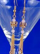 ★グラデーションをイメージしたパールビーズと上にリボンパーツ、他スワロフスキーを使用した可愛いピアスです(^o^)人気の色ピンクゴールド使用(^o^)。
