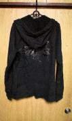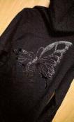 前の斜めに入った変形ジップが特徴で少しジップを下げればダブルライダース風の着こなしが可能でバックにはレザーバタフライがデザインされたかっこいいパーカーです。