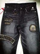 細身のストレートデニムの随所にスカルや英字のレオパードワッペンがデザインされたロエンらしいデニムです。