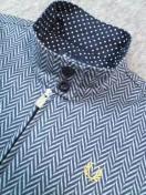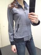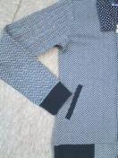 色は、濃紺×杢グレー〓で、ジャガード編みの様な模様です〓。襟内側&後首内側は、紺×白ドットの布帛地をあてています〓。モチロン羽織りもOKですが、そのまま着ても気持ちのょぃ、しっかりカットソー素材です〓。