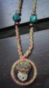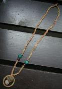 トップにはこちらもヘンプを手編みのきのこがあり、紐部分にはターコイズをウッドとバッファローボーンのビーズではさんであわせております。
