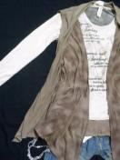 ベストの内側から綺麗なドレープが出るように演出されたしわ加工のレイヤードカーディガンとロンTの2点セット