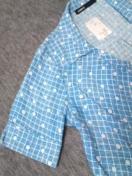 素材は〓〓レーヨン100%、で、カットソーっぽい手触りの落ち感ある素材です〓。昭和のシャツを思わせる様な、青いライン&○プリントは、レトロ感があります〓。