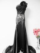 高級CONIEFOX黒ワンショルダーローズフラワートレーンロングドレスパーティー薔薇クラブ