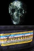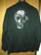 リメイクの最高級ブランドでありますリバティーンの中でもとても高級なアイテムで、ドレッシーなジャケットの背中に総スワロフスキーでスカルがデザインされています。非常に細かいスワロを無数に使った圧巻の加工で、抜群の輝きと存在感を誇ります。袖先にはほつれ加工がしてあります。ドレススタイルにも、カジュアルなデニムなどと合わせてもとてもかっこいいです。