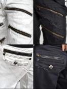 重厚な太ジップが前面に並び横糸残し加工や部分PUレザー使いも伴い非常なタフな印象を全面に打ち出したデニム