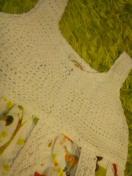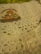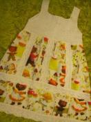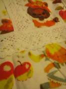 真っ白な糸のカギ針編みレースとクマサン・キノコ・女の子・リンゴの転写プリント生地を組み合わせてあります♪