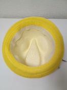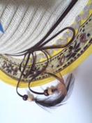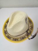 柔らかめの藁編みの様なペーパー素材で、被り込みは深めです〓。ホワイトベージュで、ツバ部分は原色黄色のリボン縫いで、上から〓茶ベースのネイティブ風刺繍のチロリアンテープがたたいてあります〓。細い革風リボンが巻いてあり、先には〓羽根〓が付いててオシャレ〓。