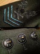 右ショルダー部にスカル刺繍、ボタンも存在感あるスカルボタンを使用。