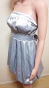 [商品情報] デカリボン&プリーツにバルーンシルエットが綺麗なドレスです。 色:シルバー系 サイズ:F 平置き⇒胸元幅32cm、脇下からの着丈65cm、ウエスト31cm、裾幅67cm 素材:ポリエステル ファスナー:横 ストレッチ:あり パット:なし 他:未使用品です。