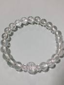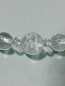 手作りの天然石ブレスレット、石は8ミリ玉水晶を主に、トップに子年の守り本尊の千手観音菩薩を表す梵字キリークを手彫りした10_玉水晶をあわせており、梵字石をカットをあしらった水晶ではさみました。