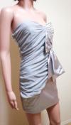 〓[商品情報] 胸元ビジュ盛りAにデカリボン&シフォン切替の華麗なドレスです。 色:シルバー サイズ:F 平置き⇒胸元幅37.5cm、脇下からの着丈64cm、ウエスト35.5cm、裾幅41m 素材:ポリエステル ストレッチ:あり ファスナー:背 透明ストラップ:あり パット:あり 他:新品タグ付です。