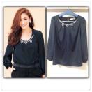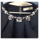 ネックラインのクリスタルビジューとパフスリーブのお袖が気品のあるサテンブラウスフロントのタックが作るドレープ感が柔かく、女性らしい印象を与えてくれます。