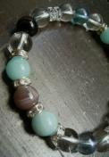 主石は水晶に四緑の緑にアマゾナイト、中央に木星を司るアゲートを配し、意思を強めるオニキス、自分を出せるアクアオーラのブルーをあわせました。