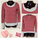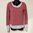 くすんだ赤系の7分袖のニットソーにライトグレーのカットソーとマルチカラーのドット柄カットソーを重ね着したみたいなレイヤード風デザイン☆