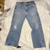 両裾上5cm辺りにロールアップ跡(筋状のスレ傷)、右裾上15cm・左膝から腿辺りに最大小豆大程度の脱色シミ(?)あり(※画像4)。