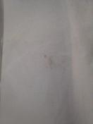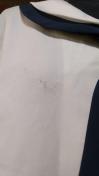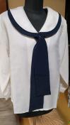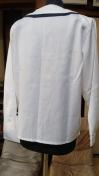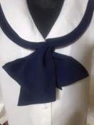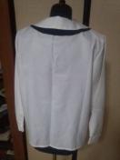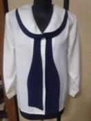 白に紺の二枚襟風ブラウスです。紺の襟は、前でりぼん結びになります。サイズは9号です。肩パッドが在ります。これは、古着になります。胸元に少々汚れがあります。又、袖付けの近くにも、少々傷が在ります。クリーニングすれば汚れは綺麗になりますが、その手間を省いて、お安くしました。