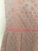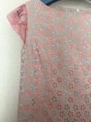 淡いピンク系のフラワー刺繍、ピンクカラーのフリル袖や切り替え部分にも