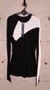 アシンメトリーなカッティングで色の違う生地を切り返したカラー使いが絶妙なデザイン。