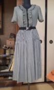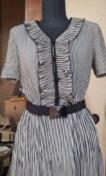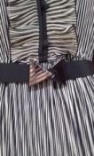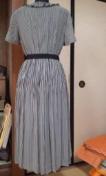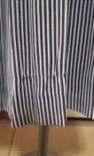 半袖のワンピースです。胸元と襟にフリルがあり、これからにピッタリです。サイズは9号、着丈は約105aです。色は白、黒のストライプです。