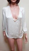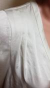 〓[商品情報] 大きめ胸元カットに肩背プリーツのシルク調カットソーです。シャーリング入り7部袖も可愛い。色:光沢アイスグレー サイズ:38 平置き⇒肩幅37cm、胸元幅54cm、着丈60cm、袖丈47cm、裾幅51p 素材:ポリエステル ストレッチ:なし 他:綺麗です。
