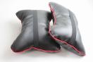 レッドパイピング付きネックパッドです。運転席や助手席のヘッドレストに取り付けて首にフィットさせ 、肩の凝りや疲れを緩和してくれるアイテムです。ヘッドレストにひっかけるだけ。裏にゴムバンドがついておりますのであらゆる車種に対応します。