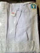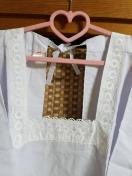 角襟レース飾り、裾フリル有りの昔ながらの割烹着です。未使用のお品で、写真撮影の為に開封いたしました。経年の保存じみ等は見当たりません。