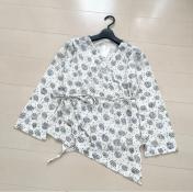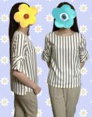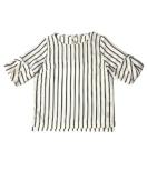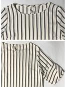 オフホワイトに黒の縦ストライプ柄です〓。襟刳り後は涙開き釦〓。袖口はタックがふわっとボリューミーな切替デザインです〓。