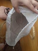 薄いサーモンピンクで茶色とドットのリボンの装飾、ゴールドのチェーン。スマホ、ハンカチ、ふたつ折り財布、リップクリーム、ファンデ程度入ります。間口幅14cm×5cm。底の方に膨らみがあるので結構入ります。チェーンの長さ118cm(端から端まで)。