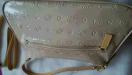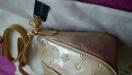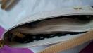 上品なベージュのお色で、何にでも合わせやすいかと思います。仕切り型ファスナー開閉式。内側、小ポケット2つ、ファスナーポケット1つあります。