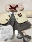 チェック柄ワンピース、ノーカラージャケット、リボン、パンツ、ボアのティペットのセットになります。