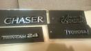 まずお先に当方喫煙者です。神経質な方、完璧をお求めの方はご遠慮下さいませ。当方出品では自己紹介欄、未記入の方は確実に削除致します。(場合によりブラリ登録も致します。) 評価に「悪い」が多数ございます方、評価をしない方も同様です。今では入手困難かつ貴重な当時モノ トヨタ 71チェイサー 純正プレート 4種類セット! 1993年度、当時に当方、71チェイサー前期購入後、即、車外品ゴールドメッキプレートに変換のため純正プレートは取り外し。中古車のため「TOYOTA」プレートのみ当初より黒枠部分に擦り傷、塗装落ちございます。「チェイサー」「アバンテ」「ツインカム24」プレートは状態も良いです。※ ツインカム24プレートのみ両面テープ止め品。他の3種プレートははめ込み式、ビス止め。※ 画像の外側ケースや台紙部分は車外品ゴールドメッキプレート収納ケースです。現在はゴールドメッキプレートなし。純正プレート4種類セット出品です。TOYOTAプレートかツインカム24プレートは車外品チェイサー用品切れのためマークU品購入でしたが当時、マークU、チェイサー、クレスタと兄弟車のため同じプレートです。※レターパックライト発送で送料込み価格です。締切日時
