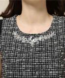 フロントネックに飾ったリュクスなビジュー使いが、アクセ不要のクラスアップアクセント!