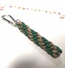 こちら、パラコードで編み込んだキーホルダー〓です〓。ベージュミックス&暗緑の2色を使いました〓。端は熱で溶かして始末しています〓。