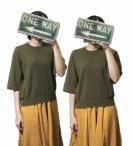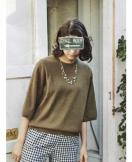 色は落ち着いたカーキ色〓。首開きは狭め&裾リブでスッキリ感もあり、ワイドな五分袖とゆったり身幅は女性らしぃ、メリハリの効いたデザインです〓。