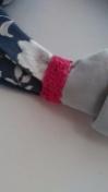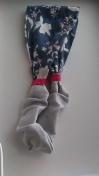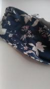 花柄のハンドメイドヘヤーバンドです。縦約11センチ、横約34センチ、柔らか素材ゴム部分はグレー、ピンクレースのワンポイント。フリーサイズ締切日時