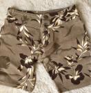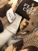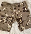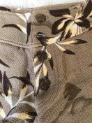 茶系の花柄で生地も軽いので履きやすいですよ。着丈は約37センチ ウエストは平置き採寸約33センチとなります。