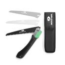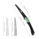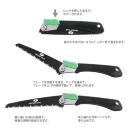 【セット内容:折込のこぎり1pc(木工用刃付き)、硬質プラスチック用替え刃1pc、鉄工用替刃1pc、専用収納ケース1枚。展開状態で全長は445mmで、刃渡り約190mm、ブレード厚みが0.9mmです。アウトドア、キャンプ、ガーデニングから日曜大工まで様々な場面で活躍します。
