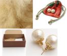 コットンパールの上品なピアスをアンティークスカーフの巾着袋に入れて肩にかけています。