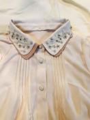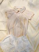 薄いベージュ、ビジュー襟は付け襟、ボタンで取り外し可能取るとシンプルなシャツ、パフ袖、丸いコロンとしたボタン、胸元プリーツ