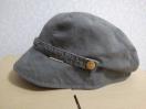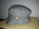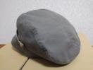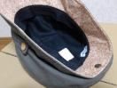 洗いざらしたようなキャンバス地の帽子で正面ツバ上に飾りのテープと木のボタンがついています。後ろにスナップボタンが付いていてボタンを止めればキャスケット、外せばツバ広の帽子になる2WAY使用、裏地は汗で蒸れにくいように黒メッシュのポリエステル地になっています。